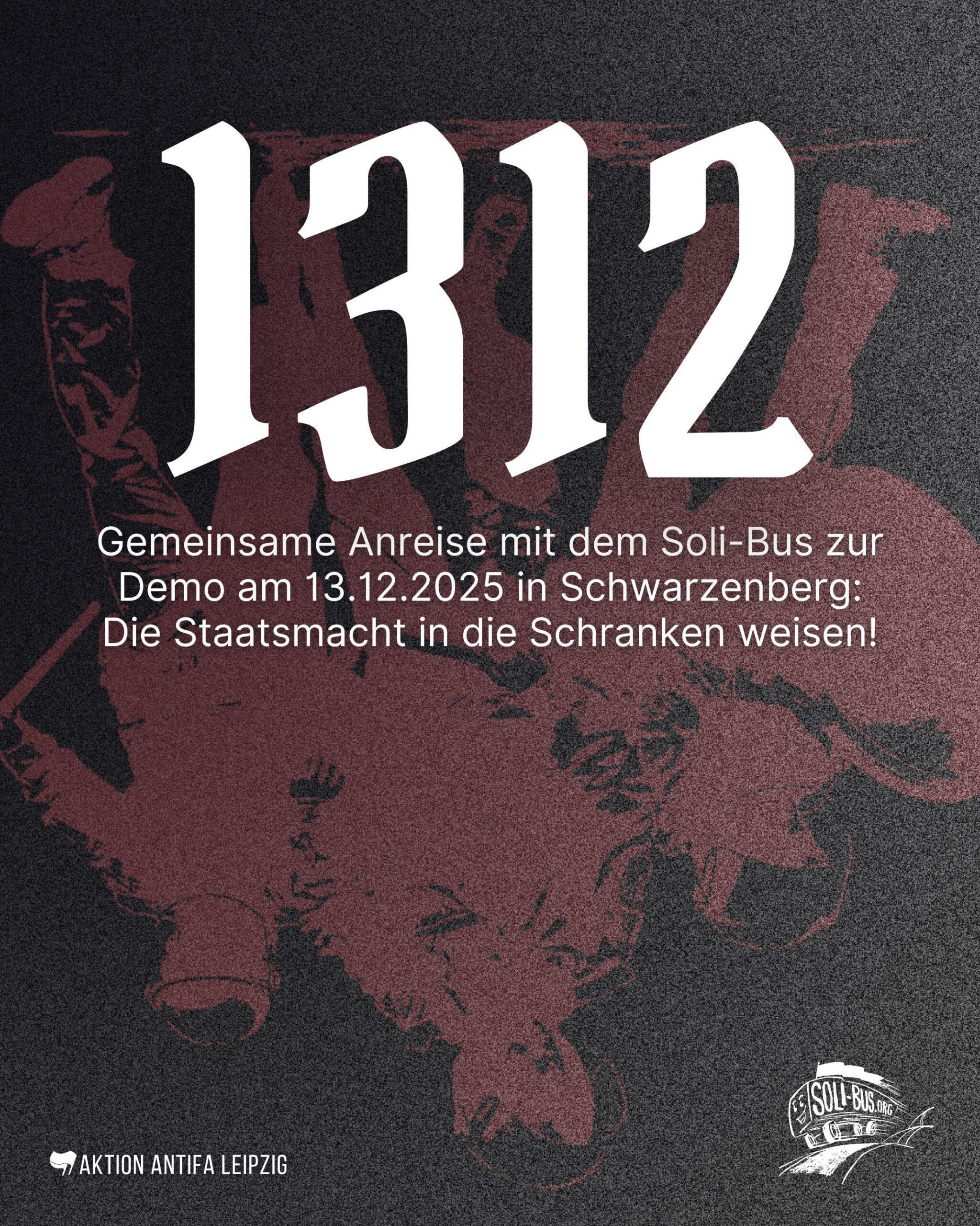 Wir rufen dazu auf, am 13.12.2025 mit dem Solibus von Leipzig zur Demo der Genoss*innen in Schwarzenberg zu fahren. Ihr könnt euch hierfür ab jetzt Tickets reservieren, indem ihr euch unter aktionantifaleipzig@riseup.net anmeldet. Seid schnell, da wir eine gewisse Planungssicherheit im Voraus brauchen. Preisempfehlung für ein Ticket sind etwa 10-15€. Falls ihr etwas Geld über habt, dann gebt gerne auch etwas mehr damit Menschen, die aktuell wenig Geld zur Verfügung haben mitfahren können.